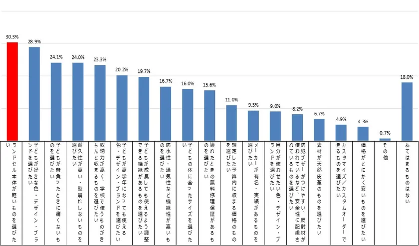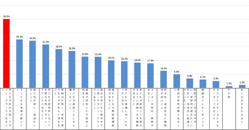 (4) ランドセル選びは機能より見た目?親がランドセル購入時に重視すること1位「子どもが好きな色・デザイン・ブランドであること(50.0%)」