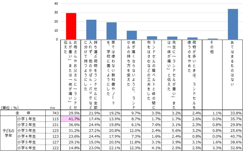 子どもからランドセルの重さ・体の痛みを訴えられたときの親の対処法は「持ち運ぶ荷物をランドセルに全部入れず、他のかばん・バッグなどに分けて持たせるようにさせた(35.1%)」や、いわゆる“置き勉”と言われる「家では使わない教科書やノートを、学校に置くようにアドバイスした(23.5%)」などと、ランドセルの素材や機能に頼らず、少しでも重さを軽減することで対処する実態が明らかになりました【図4】。また、子どもが重さや痛みを感じたときにとった対処法は「お母さんやお父さんに「ランドセルが重い」または「体が痛い」と伝えた(29.5%)」、「持ち運ぶ荷物をランドセルに全部入れず、他のかばん・バッグなどに分けて持つようにした(21.9%)」、「家では使わない教科書やノートを、学校に置くようにした(19.2%)」とお父さんお母さんの助言に従っている結果となりました【図5】。特に小学1年生ではお母さんやお父さんに「ランドセルが重い」または「体が痛い」と伝えた41.7%と半数近くが親に相談しており、他の学年より親の重要性が高いと言えるかもしれません。