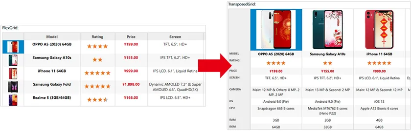 データグリッドの行と列を入れ替えて(転置して)表示できるコントロールです。行が縦方向に/列が横方向に並んだ表示の並べ方を逆にして、行を横方向に/列を縦方向に並べて表示できます。