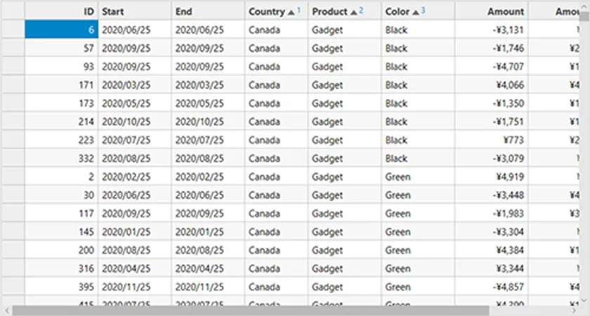 表の中にある複数の列ヘッダを続けてクリックすると、クリックした順にソートができます。列ヘッダにはソートされる順番を示す数字が表示されます。