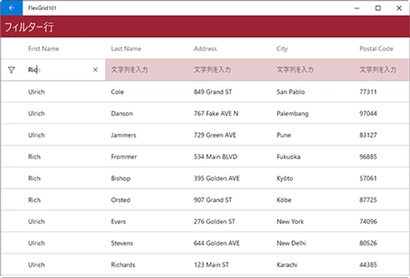 フィルター行は各セルに入力用のテキストボックスが配置されている固定行で、テキストを入力することでその列内で入力された値が含まれるデータをフィルタリングすることができます。