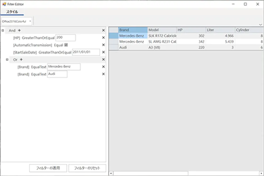 グリッドやリスト、ツリービュー、チャート、マップなどに対してフィルタリング操作を提供するコントロールです。ANDやORによる条件項目をツリー階層表示で設定することができます。