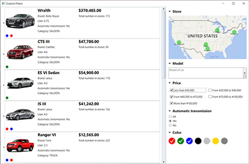 直観的な操作でデータのフィルタリングを行うことができるコントロールを提供します。アコーディオンレイアウトを使用したグループの管理や、フィールドのデータ形式に基づいたフィルタ処理が可能です。また、グリッド、リスト、ツリービュー、チャート、マップなどのデータ視覚化コントロールと組み合わせた使用も可能です。