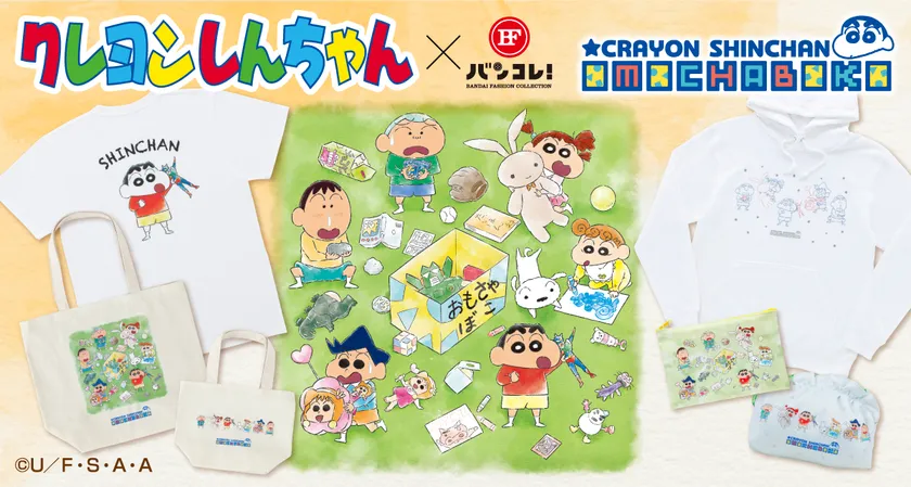第1弾では、シリーズ名にちなんでおもちゃ箱をひっくり返したようなしんちゃんたちの描きおろしイラストをデザインしたアパレルアイテムを全6種展開します。