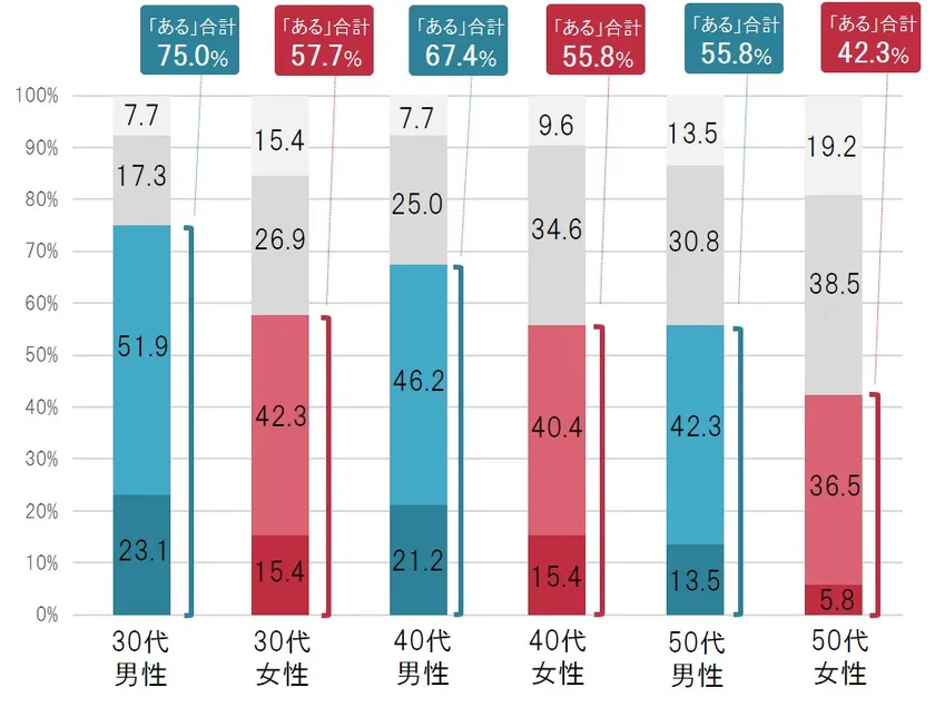 便秘のある人は、男女ともに仕事のパフォーマンス低下を自覚している方が多いという結果がみられました。男性は、どの年代でも、パフォーマンスが低下すると回答した割合が女性より高く、とくに30歳代男性では、75.0%と高率でした(図1)。