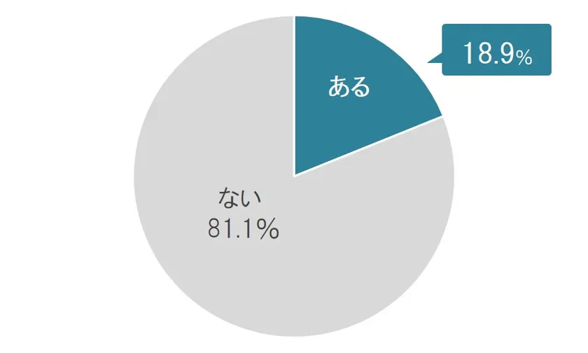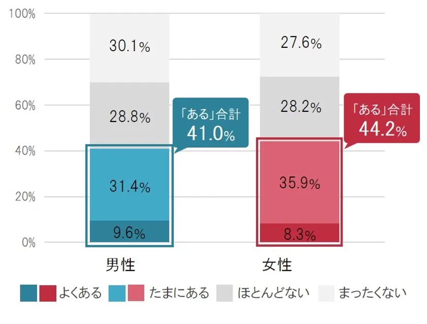 便秘と休暇の関連については、40%以上が便秘で休みたいと思ったことがあると回答しました(図3)。さらに、実際に仕事を休んだことがある人の割合は18%を超えていました(図4)。性差をみると、休みたいと思った経験は女性の方がやや割合が高かったのですが(図5)、実際に便秘で仕事を休んだ人の割合は、女性は男性の半分にも達しませんでした(図6)。