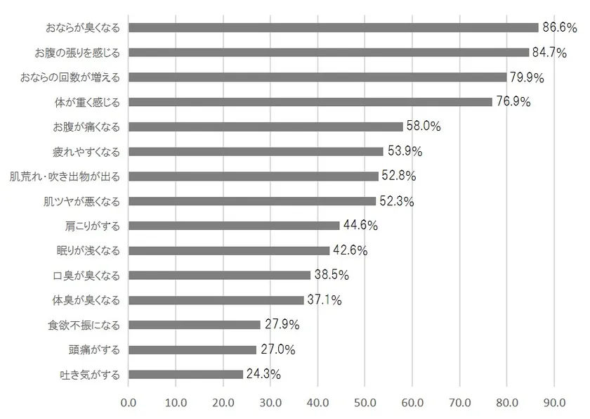 身体の不調で最も多かったのは、「おならが臭くなる」で、次いで、「お腹の張り」、「おならの回数が増える」など、予測された通り、お腹についての訴えが目立ちました。しかし、お腹の不調以外も少なくなく、「疲れやすさ」、「肌の不調」や、「眠りが浅い」、「食欲不振」などの生活の基本的な条件、さらに、「肩こり」、「頭痛」など、ストレスに起因するような自律神経の失調と関係するものなど、幅広い身体的な不調がみられました(図8)。