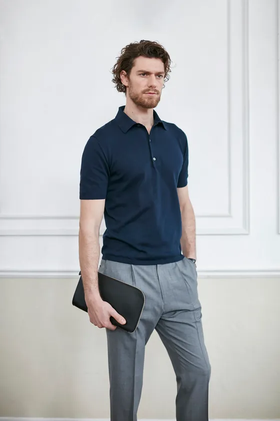 テーラーが監修したポロシャツの型紙をベースにした、スビンニットポロシャツ。一般的なニットでは作成しない型紙作りから始めることで、人体のラインやニットの特性を考え、肩や腕まわりの動きを見直し、袖を前振りにすることで、動きやすくごわつきにくい着心地とシルエットを実現しました。襟部分は、編み地や糸の詰め具合を調整し、まるでドレスシャツのように、ボタンを開けても閉めても美しいロールが生まれるように設計しています。ジャケットとの相性の良さはもちろん、オンオフを問わずに着ていただくことができます。