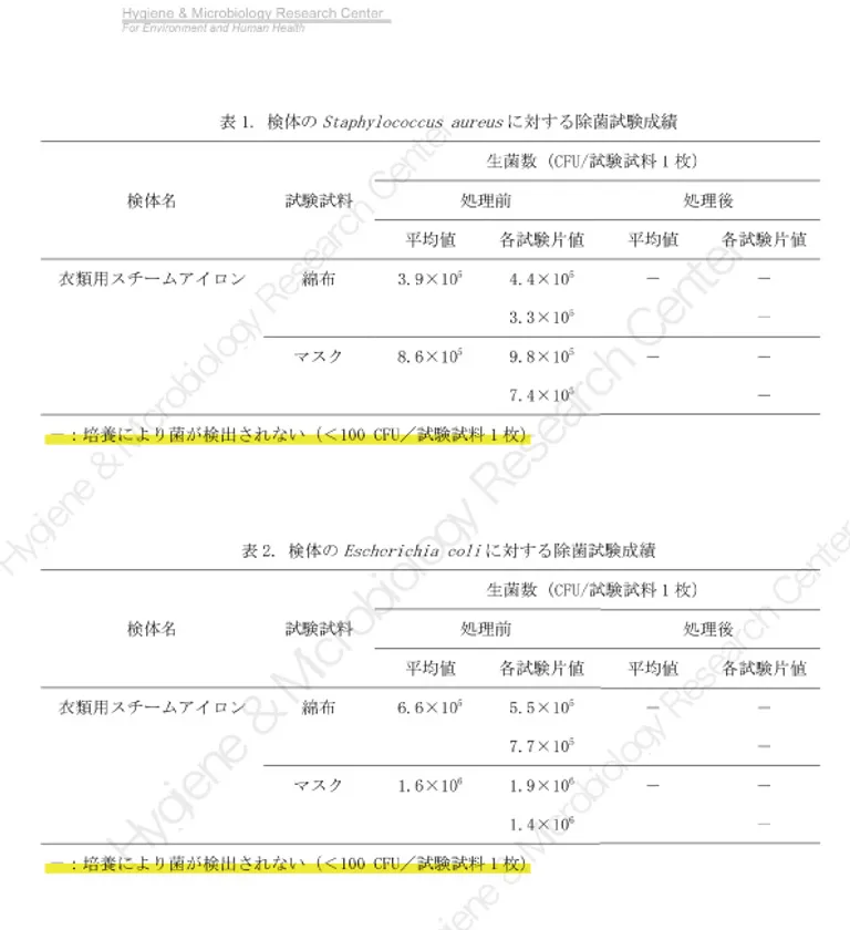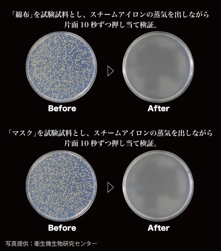 ※2 試験機関:株式会社衛生微生物研究センター 試験報告書番号:2020D-BT-154 試験方法:50mm×50mmに切断した綿布と30mm×25mmに切断した市販のマスクを試験試料とし、試験菌液を綿布には0.1mL、マスクには0.05mL接種。その後、検体に滅菌水を入れて電源を入れ、蒸気出しながら試験試料に片面10秒間ずつ、合計20秒間押し当てた。 検査結果:菌が検出されなかった。