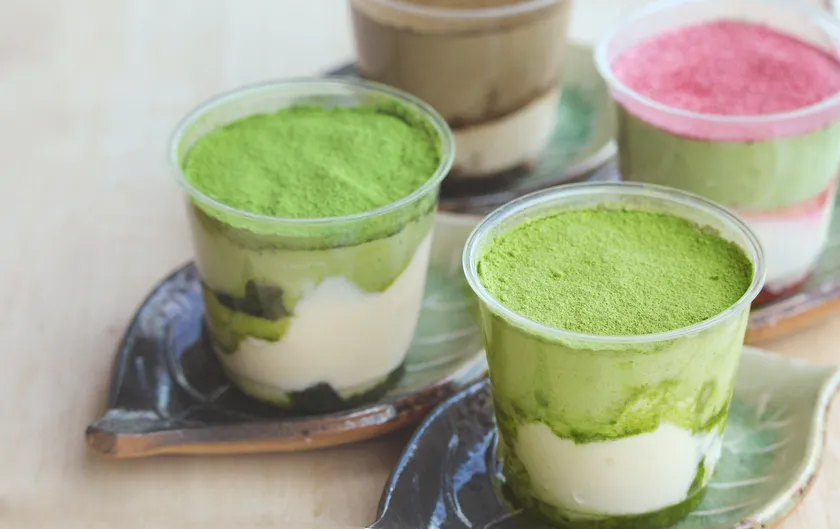 ティラミスは、お茶クリームとマスカルポーネクリームの2層構造。その間を茶葉の旨味を活かした抹茶蜜やほうじ茶蜜と自家製ビスキュイが味わいにアクセントを加えています。