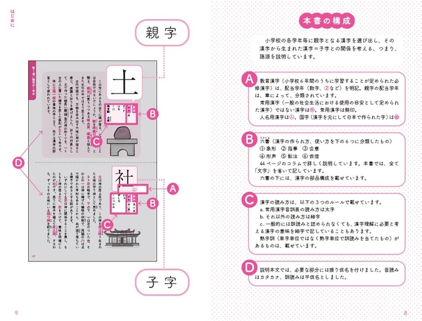 ほとんどの漢字字典は、部首(偏や旁)で漢字を分類・説明していますが、本書では部首ではなく、漢字の中の同じパーツである「音符と意符(漢字から偏や旁を引いてあとに残ったもの。本書では親字(おやじ)としています)」に着目。その漢字から生まれ出た漢字= 子字(こじ)との関係を考えていきます。
