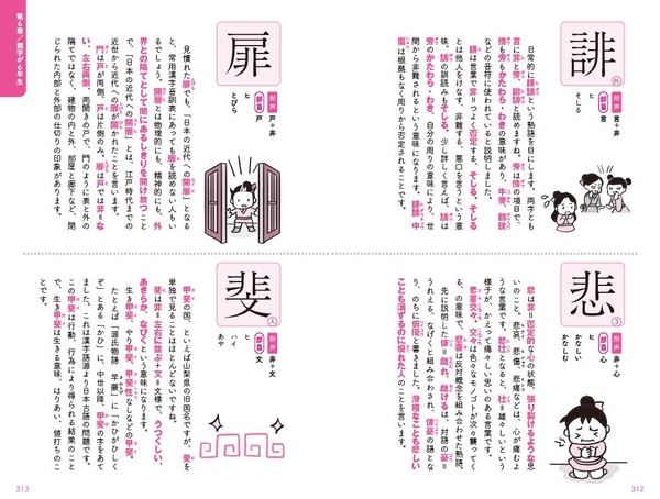 また、各章の冒頭に、親字と子字の関係が分かるよう、漢字構成図を載せました。この図は、読者の理解を助けるため、まるで授業で黒板に書かれた説明図のような役割となります。後にある漢字説明の補助としたり、読後、この図を見て漢字関係を思い出したり、記憶を補強したりするのに参照してください。
