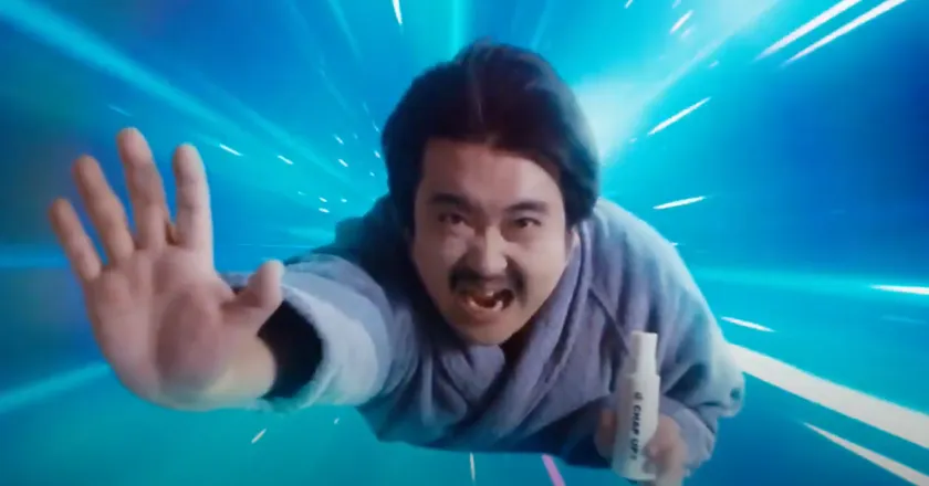 宇宙へと飛び立った鈴木さんが、青い地球をバックに巨大なチャップアップ育毛剤とともに映し出されます。「頭皮ケアはカッコいい」という天の声が印象的なシーンです。