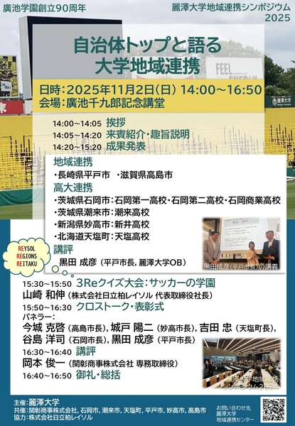 麗澤大学(千葉県柏市/学長:徳永澄憲)は、11月2日(日)麗澤大学地域連携シンポジウム2025~自治体トップと語る大学地域連携~を開催いたします。