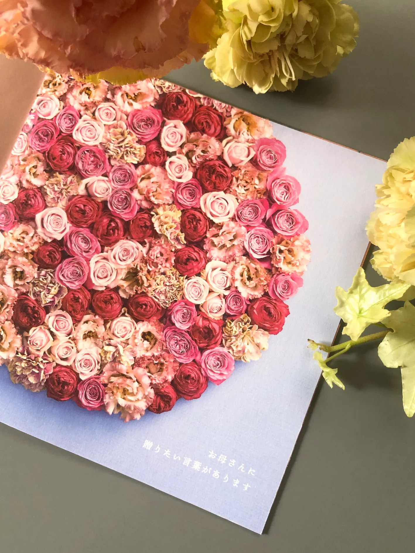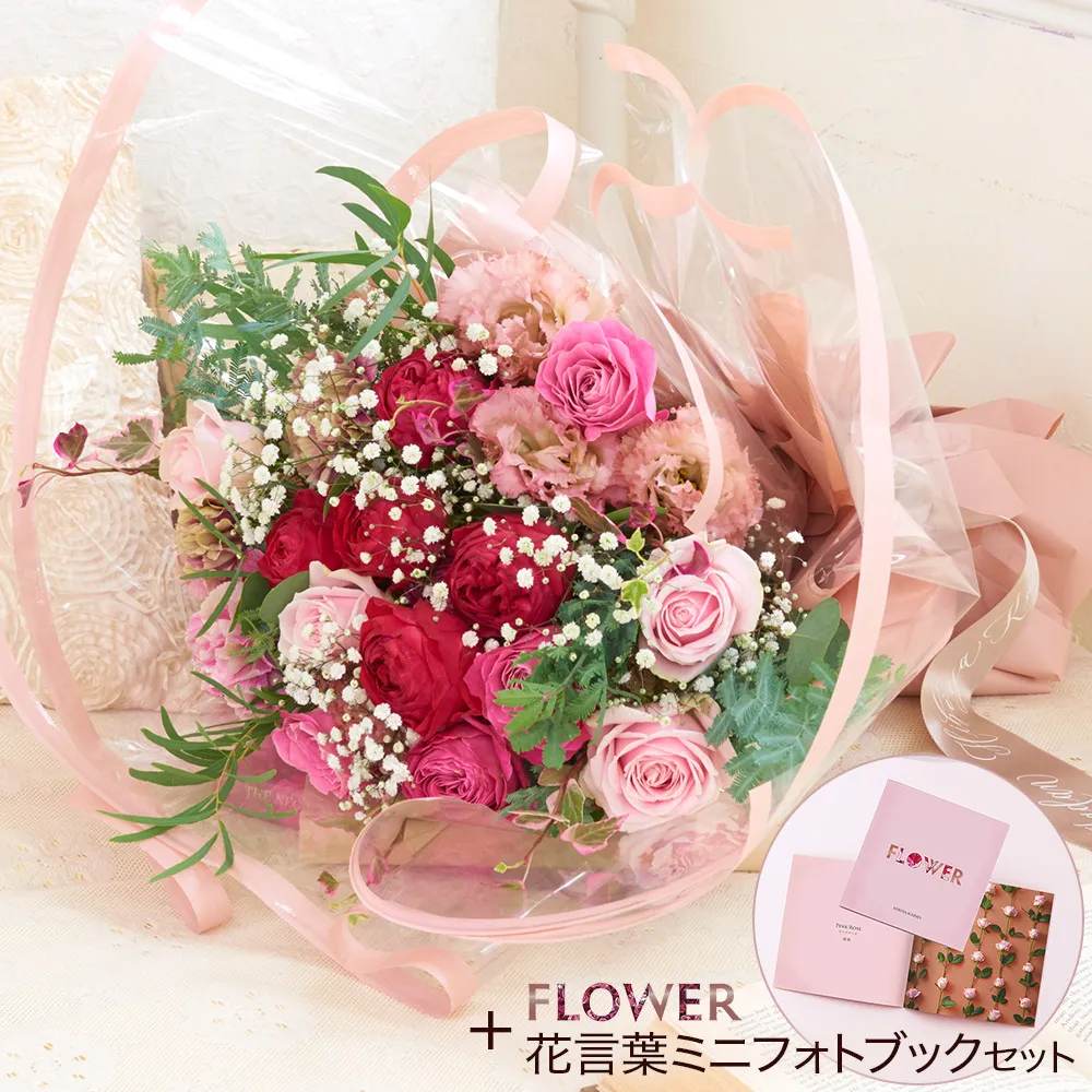 ブーケにセットになっているミニフォトブック内の花の写真は全て撮り下ろしとなっており、それぞれに、ブーケに使われている花の花言葉が書かれています。ピンクローズは「感銘」、カスミソウは「感謝」、リシアンサスは「優美」、カーネーションは「無垢で深い愛」の花言葉を持っています。手書きでメッセージを書き添えてプレゼントするのはいかがでしょう?