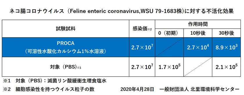 古河電工グループの商社である古河産業株式会社(本社:東京都港区、代表取締役社長:横田 敦彦)と「世界に『ない』ものを創造すること」をテーマに研究開発を展開する株式会社日本抗菌総合研究所(本社:奈良県奈良市、代表取締役:富士野 彰宏)は、このたび「PROCA」(可溶性水酸化カルシウム)が新型コロナウイルス(COVID-19)と同じくコロナウイルス科に分類されるネコ腸コロナウイルスを用いた不活化試験において、10秒で99.9%不活化効果を確認したことをお知らせします。