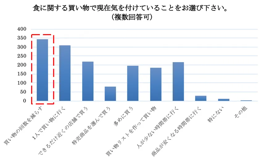 最後に現在食に関する買い物で気を付けていることがあるかという問いに対して冒頭での質問同様「買い物の回数を減らす」が342人と一番多く、次に「一人で買い物へ行く」が308人、次に「できるだけ近くの店舗で買う」が219人、「人が少ない時間帯に行く」が215人という結果となりました。1位となった買い物の回数を減らす行為は感染対策ももちろんですが、家計の圧迫も想定されるためコスト対策の方がより強い傾向にあると伺えます。
