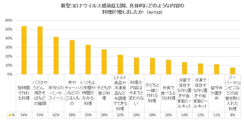 具体的な料理の上位は、「短時間で作れる料理(54%)」「パスタやうどん、焼きそばなどの麺類(53%)」「手作りのパンやスイーツ(42%)」という結果になりました。お子さんが喜ぶ料理や一緒に作れる料理も約20%ほど回答があり、時短・簡単料理のニーズが高い一方、在宅時間が増えたことでパンやスイーツ作りなどの料理を楽しまれている方もいるようです。