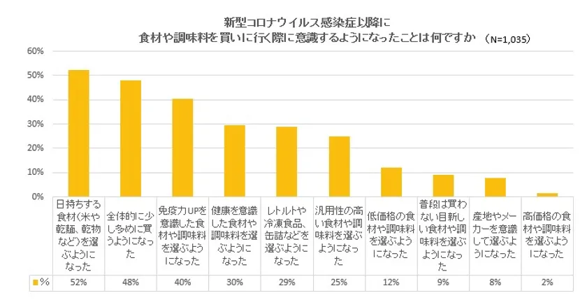 食材などの購入で意識するようになったことの上位は、「日持ちする食材(52%)」「少し多めに買うようになった(48%)」「免疫力UPを意識した食材や調味料(40%)」という結果になりました。日持ちもして常備しやすい食材や健康を意識した食材への傾向が多いようです。その他、「子どもがずっといるのでパン、おやつが増えた」「お昼に野菜やお肉と併せてパッと作れるソースやスパイス」「子供も手伝いやすいこと、汎用性があることから挽肉の購入が増えた」などの声もありました。