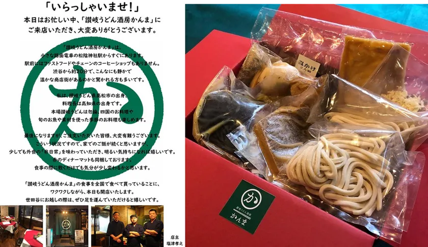 「讃岐うどん酒房かんま」を運営する株式会社味作家(所在地:東京都世田谷区、代表取締役:塩津 孝之)は、新型コロナウイルス感染症の拡大の影響で全国的に行われている外出自粛のなか、ご自宅で香川の本格讃岐うどんを楽しんでいただくため、讃岐うどんと料理セットの全国クール便配送サービスを2020年4月1日(水)から開始しました。