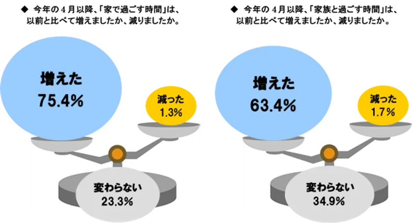 今年の4月以降、「家で過ごす時間」は、以前と比べてどう変化したかを聞いたところ、75.4%の人が「増えた」と回答。また、今年の4月以降、「家族と過ごす時間」は、以前と比べてどう変化したかを聞いたところ、63.4%の人が「増えた」と回答しており、ウイルス感染防止のために実施されている外出自粛は、人々にとって不安ではある一方で家族との時間が増える結果をもたらしているようです。