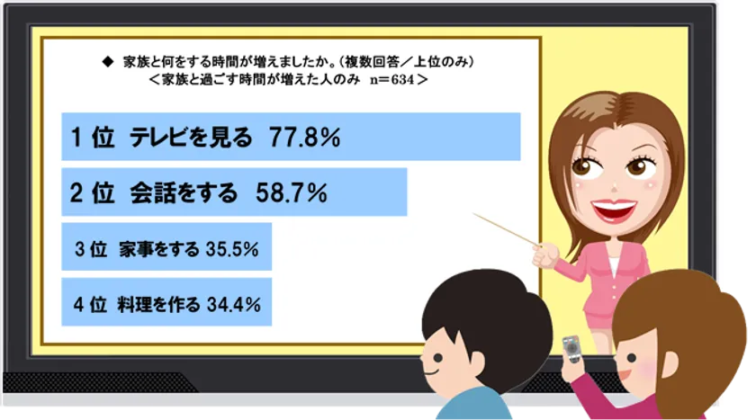 「家族と過ごす時間が増えた」と回答した人に対し、家族と何をする時間が増えたか聞いたところ、最も多かったのは「テレビを見る」で77.8%の人が回答。次いで「会話をする」58.7%となっており、家族と過ごす時間の増加に伴い、コミュニケーションの機会も増加しているようです。