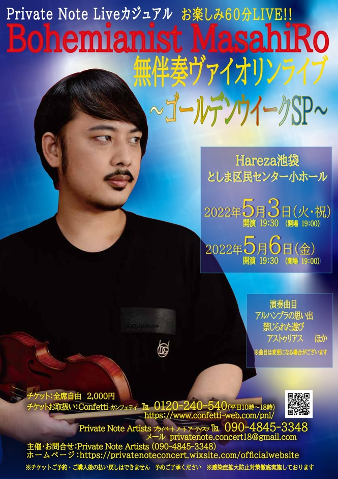 Private Note Artists主催、Private Note Liveカジュアル『Bohemianist MasahiRo無伴奏ヴァイオリンライブ ~ゴールデンウイークSP~』が2022年5月3日(火・祝)、5月6日(金)にHareza池袋 としま区民センター小ホール(東京都豊島区)にて開催されます。