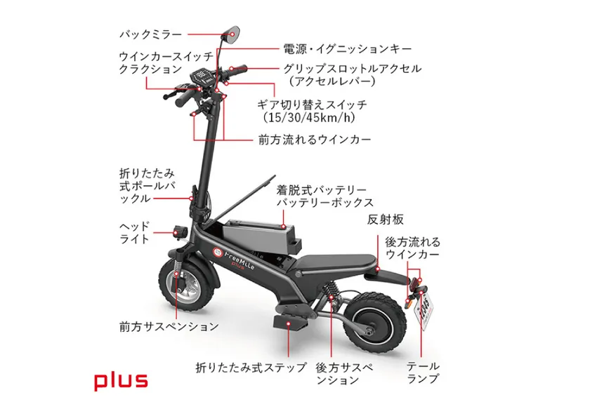 太くて大きなオフロードタイプのタイヤに4つの高性能なサスペンションが付き、凸凹した日本の道路でもパワフルな加速で走行できることが特徴。自転車同様、レバー式で操作するブレーキはダブルディスクブレーキ、専用のイグニッションキーがつき、グリップのスロットアクセルで操作、取り外しが可能なサドルも標準装備。