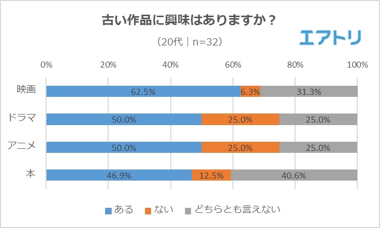 20代の人に対し、古い作品(映画・ドラマ・アニメ・本)に興味があるかどうかを聞いたところ、全てにおいて「興味がある」が多数派となりました。中でも「映画」に対しては「興味がある」が62.5%だった一方で、「興味がない」は6.3%に留まり、最も若者が興味を示していることが分かりました。
