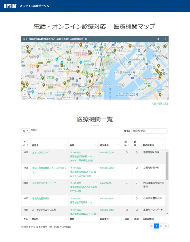 AI・IoT・ビッグデータプラットフォームのマーケットリーダーである株式会社オプティム(以下 オプティム)は、2020年4月24日に厚生労働省より公表されたオンライン診療・電話診療を行う医療機関(全国約10,000件)※1について、マップ確認・リスト検索が可能な「オンライン診療ポータル」を無償公開いたします※2。
