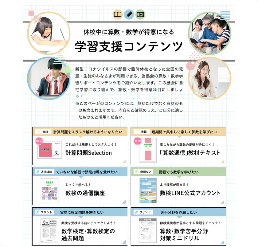 公益財団法人日本数学検定協会(所在地:東京都台東区、理事長:清水 静海、以下「当協会」)は、新型コロナウイルス(COVID-19)の影響で、長期にわたって休校となり授業を受けられない全国の小学生・中学生・高校生・大学生に向けて、当協会の算数・数学の学習支援コンテンツをまとめて紹介する特設ページ「休校中に算数・数学が得意になる学習支援コンテンツ」を2020年5月1日(金)に公開いたしました。