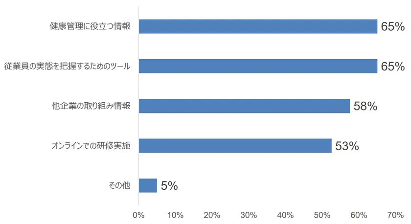 3)企業の健康推進担当部署や人事が現在必要と感じていることとして「従業員の実態把握のツール」や「(オンラインで実施可能な)健康情報の発信」が多数を占めた