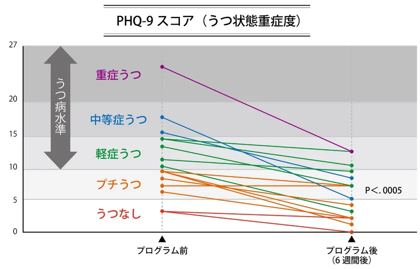 本プログラムのうつの改善効果については、2020年2~3月に実施された事前トライアルで効果検証を終えています。実際には、全国の会社員16名(うち1名は海外から参加)に対して、週1回1時間のセッションが全6回にわたって実施されました。プログラムを実施した後、うつの改善効果が証明されました(図参照)。今回はこの効果をさらに大規模かつ厳密なトライアル(無作為化比較試験:RCT)で証明するために行われます。