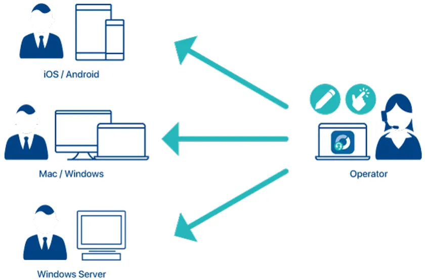 「Optimal Remote」とは、お客様のパソコン、AndroidやiPhoneのスマートフォン、タブレット、オフィス内IT機器などの画面を、サポートオペレーターやIT管理者が遠隔で共有、操作することができるリモートサポートサービスです。「Optimal Remote」をご利用いただくことで、OS設定、アプリケーションなどの操作やトラブルの解決を支援し、口頭説明よりも直感的でスピード感のあるサポートを行うことができるため、お電話でのサポートに苦労されている、本社と拠点が遠隔地の企業様や、通常業務とサポート業務を兼任されているIT管理者様に重宝されています。