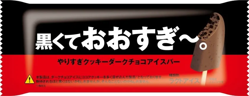 昨年の5月に発売され、好評を頂いた「おおすぎ~。やりすぎクッキーアイスバー」がリニューアル!「黒くておおすぎ~。やりすぎクッキーダークチョコアイスバー」として新たに発売いたします。