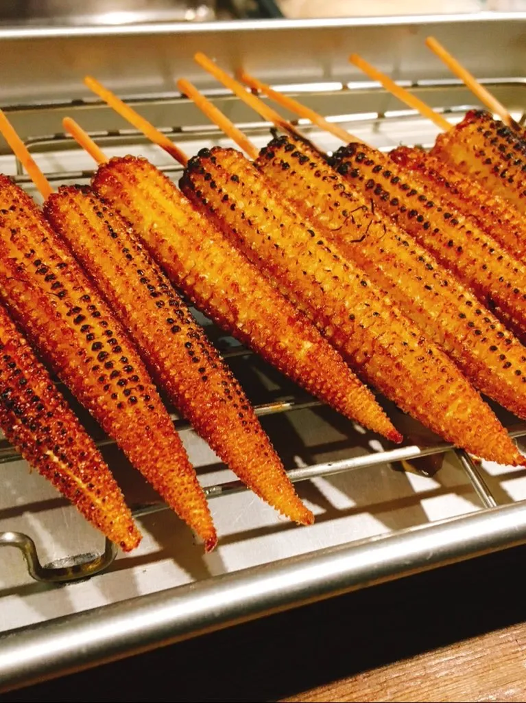 ・人気ナンバーワンの「ヤングコーンの串揚げ(焦がし醤油味) 1ダース」:500円