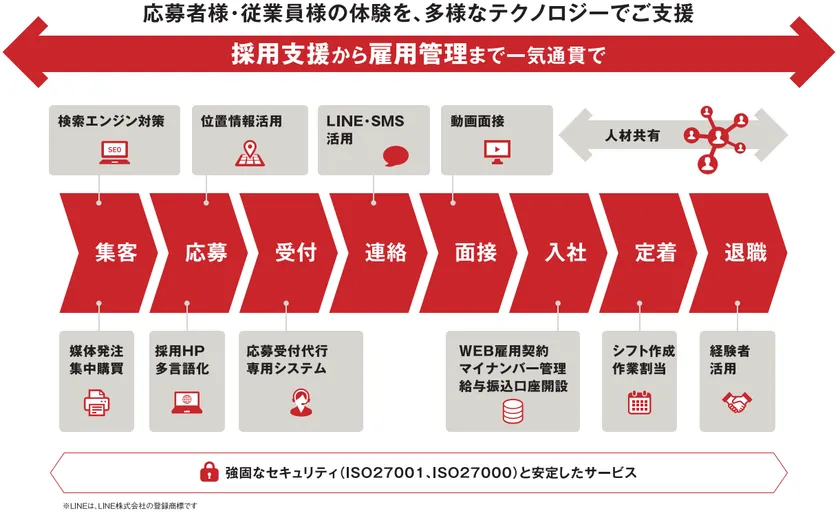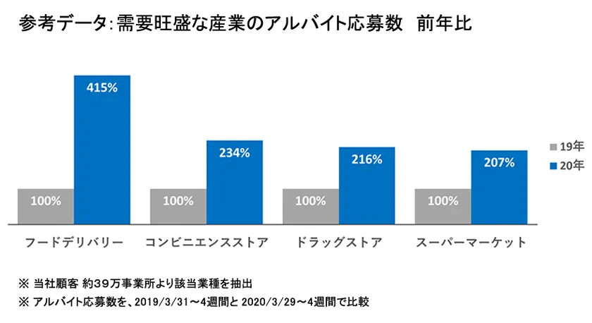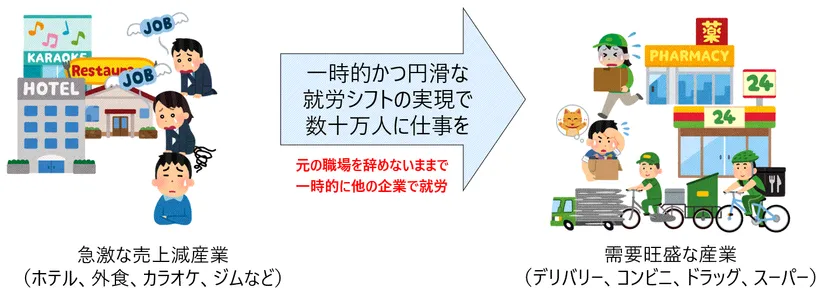 新型コロナウイルスの感染拡大に伴い、宿泊、飲食、カラオケ、スポーツジム、美容、ファッション、ほか幅広い産業分野において、需要の縮小から従業員の雇用維持に問題が発生しています。一方で、スーパーマーケット、ドラッグストア、フードデリバリー、コンビニエンスストア、運輸運送業など、急激な需要の拡大により、深刻な人手不足に陥っている企業が増加しています。
