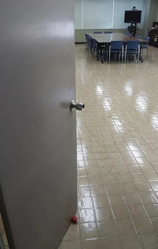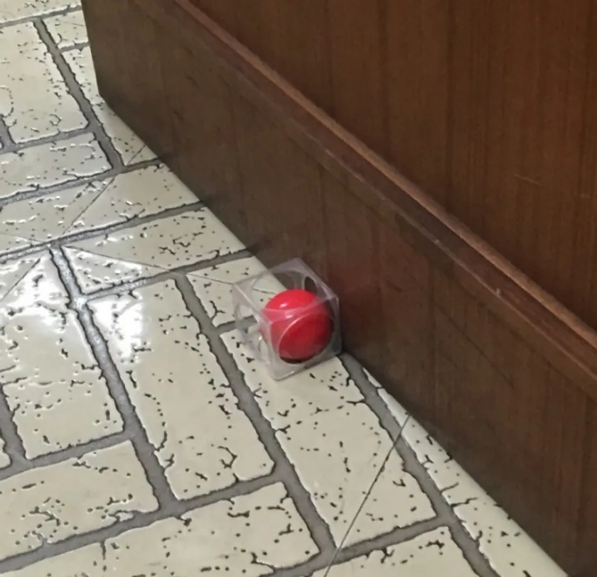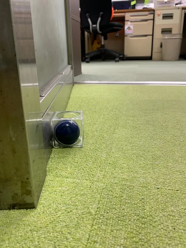 ドアクローザーのついているドアの前に「ドアキューブ」を置くと、ドアに押されてボールとドア面・床面の2点で大きな摩擦が生じ、同時にドアに押され変形したボールが元に戻ろうとする反発力によってドアが止まります。