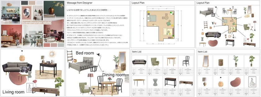 コンセプト、家具のレイアウト、家具の組み合わせイメージ、商品リスト、商品購入URL