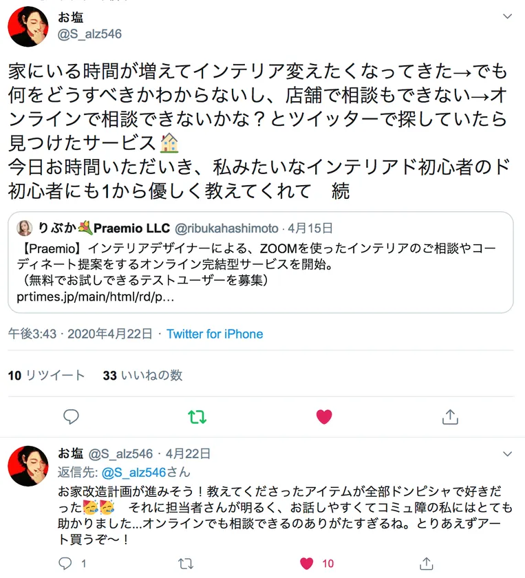 合同会社Praemio(所在地:東京都渋谷区、共同代表:島 ひかる、橋本 梨舞華)は、Zoomを使ったオンライン対面専門のインテリアコーディネートサービス「zoom interior(ズームインテリア)」を、2020年5月8日(金)より開始します。新型コロナウイルス感染拡大により厳しい状況に置かれているインテリアコーディネーターと、家のインテリアをコーディネートして欲しいユーザーを繋げ、全国のインテリアコーディネーターを応援します。