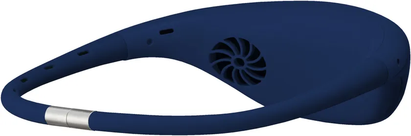 首まわりの温度を下げることで体感温度を下げることができます。正面の吸気口から空気を吸いこみ、シリコン製の送風チューブから風を送り出します。