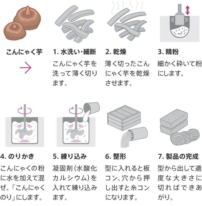こんにゃくの原料はこんにゃく芋ですが、地面の中にある球形に肥大した茎で、通常3年ほどかかって成長します。こんにゃく芋そのものは、そのままでは食べることはできず、長期の保存もできません。そのため、こんにゃく芋を乾燥させて精粉(せいこ)と呼ばれる粉にしてから加工します。今、こんにゃく製品を1年中食べられるのは、この精粉を加工するようになったためなのです。