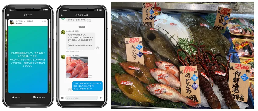 スーパーのリクエスト発信画面/産地からの提案メッセージ/高級魚が並ぶ鮮魚コーナー