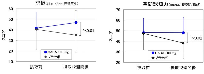 認知機能の衰えを感じる40歳以上の健常者120名を対象として臨床試験を実施しました。被験者は3か月間、GABA(ギャバ、γ-アミノ酪酸)※1を毎日100mgまたは200mg摂取しました。認知機能の測定には、CognitraxおよびRBANSと呼ばれる認知機能検査テストを用いました。その結果、GABAを摂取した群の被験者は、GABAを摂取しなかった群(プラセボ群)に対して有意※2に認知機能が維持・改善されました。特に、「記憶力※3」および「空間認知力※4」は100mgの摂取で維持・改善が見られました(下図)。また、200mgのGABAを摂取すると「記憶力」、「空間認知力」に加えて、「論理的思考力※5」、「作業記憶力※6」、「持続的注意力※7」も維持・改善されました。さらに、認知機能とともに「活力」や「心の健康」が改善されることも明らかとなりました。なお、本研究成果は2報の論文として2020年3月発行の「薬理と治療」誌に掲載されております。
