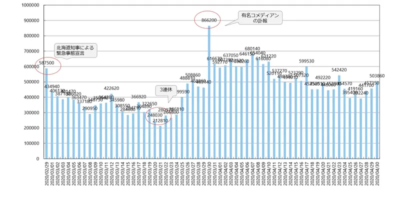 ■コロナ関連のツイート件数の激増。最大のきっかけは某有名タレントの訃報