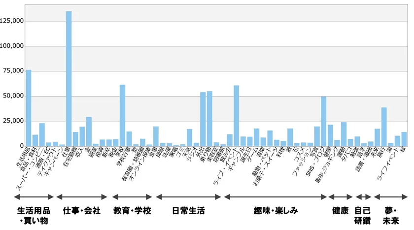 圧倒的に多かったのは「仕事」関連、次いで入手困難になったマスク、トイレットペーパーなどの「生活用品」に関する話題でした。大きなテーマとしては「生活用品・買い物」「仕事・会社」「教育・学校」「日常生活」「趣味・楽しみ」「健康」「自己研鑽」など多岐に亘りました。