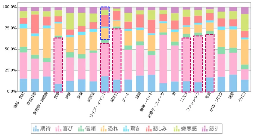たとえば「ライブ・イベント」については「喜び」「期待」の感情を示す発言が一定割合あるのと同時に「恐れ」「悲しみ」の感情も多く含まれることが分かります。卒業式や新年度の始まりを楽しみにしている感情と同じくらい、「コロナの影響によって中止になるのではないか」「ウイルスを友達に移してしまったり、移されたりするリスクがあるのではないか」といった不安の感情も広がった結果と捉えられます。