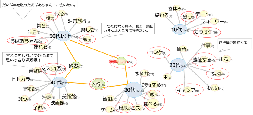 その結果、10代は「歌う」+「カラオケ」、20代は「遠征」「焼肉」「キャンプ」、30代は「食べる」「温泉」「旅行」、40代は「子どもと」「マスクなしで」、50代は「娘」「おばあちゃん」「母」などが各世代における特徴語として抽出されました。10代、20代は比較的お金をかけずに近場で仲間と楽しみたいといった希望が見られます。一方、30代になると自由に使えるお金の事情も絡み「飲食」「旅行」が浮かび上がってきます。さらに40代以上になると「何がしたいか」に加えて「誰と」という要素が目立ち、その中心が家族であることが大きな特徴と言えます。
