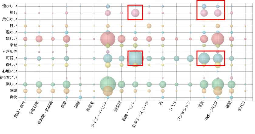 例えば「動物・ペット」には「可愛い」「癒し」という発言があり、多くの写真が掲載されているサイトや動画を紹介する内容もありました。また「写真」「SNS・ブログ」には「可愛い」「癒し」に加えて「懐かしい」といった発言が多くみられ、自身のPCやスマホから過去の写真を投稿していました。