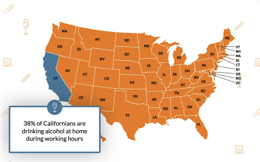 アメリカのアルコール依存症支援団体Alcohol.orgが3,000人のアメリカ人労働者に対して行った調査によると、例えばカリフォルニア州とニューヨーク州では対象となった労働者の38%が「在宅勤務中に飲酒している」と回答しています。また、全回答者の1/3以上が1人でいる時には飲酒量が増えると答え、1/5の回答者が隔離に備えてアルコールを備蓄したと回答しています。